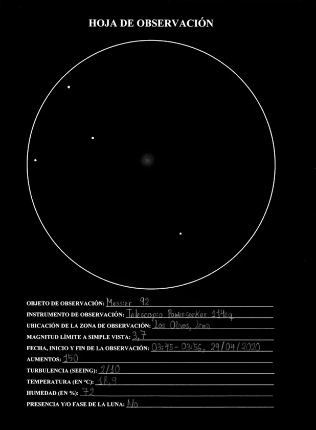 Hasta aquí llegó la racha de noches despejadas. No fue sino hasta el 29 de Abril cuando por fin pude dibujar otros dos objetos de cielo profundo: el cúmulo globular M92