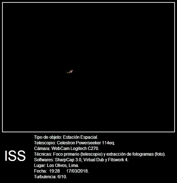 A pesar de no ser un objeto planetario, la Estación Espacial Internacional (ISS) se ha convertido recientemente en un objetivo popular entre la comunidad de astrónomos aficionados ya que, al igual que los planetas, posee un tamaño aparente lo suficientemente grande como para observar detalles de su estructura con un telescopio de poca apertura. El día 17 de Marzo del 2018 tuve mi primera oportunidad de cazar este escurridizo objetivo con mi telescopio de 114 mm de apertura, y digo escurridizo porque para cazar la ISS el astrónomo aficionado debe mover el telescopio conforme la ISS atraviesa el cielo, lo cual lo suele hacer en menos de 5 minutos en promedio, algo inaudito comparado con otros tipos de objetos astronómicos.