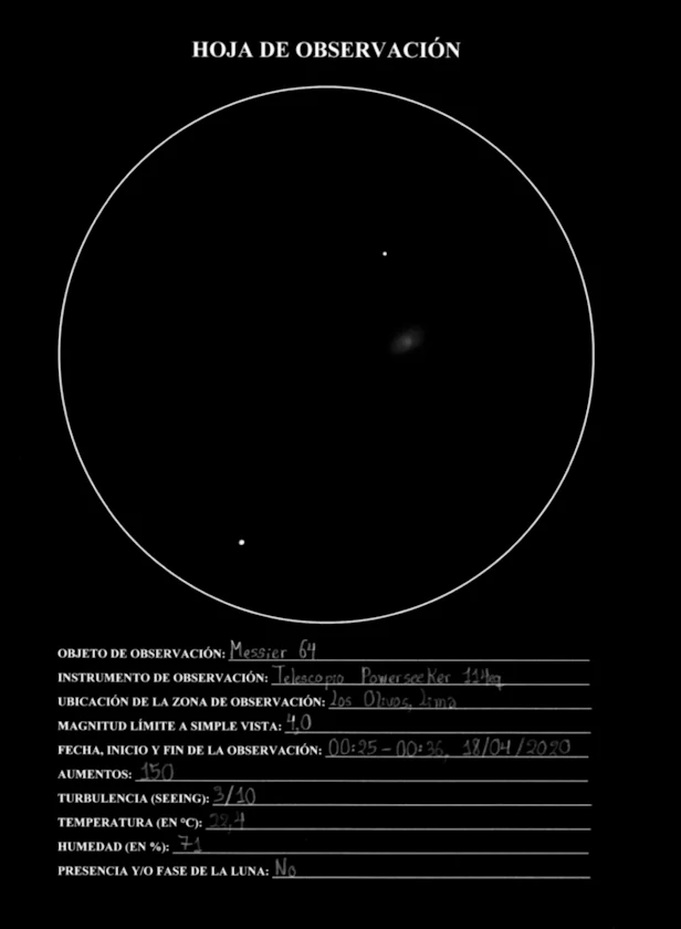 Más conocida como la Galaxia del Ojo Negro, M64 es una galaxia espiral no barrada ubicada en la constelación de Coma Berenices a una distancia de 17 millones de años luz. Con una magnitud aparente de 8.5 y un área visual de 9'45"x5', M64 es comparable en brillo y tamaño con M49, una de las galaxias más resaltantes del cúmulo de Virgo. No es de sorprender, entonces, que al igual que M49, recién haya podido cazar a M64 con mi telescopio de 114 mm de apertura desde la ciudad de Lima durante una de las varias noches anormalmente oscuras de la pandemia (ver Cielos de Pandemia en la sección HISTORIAS); específicamente, la noche sin Luna del 18 de Abril del 2020: